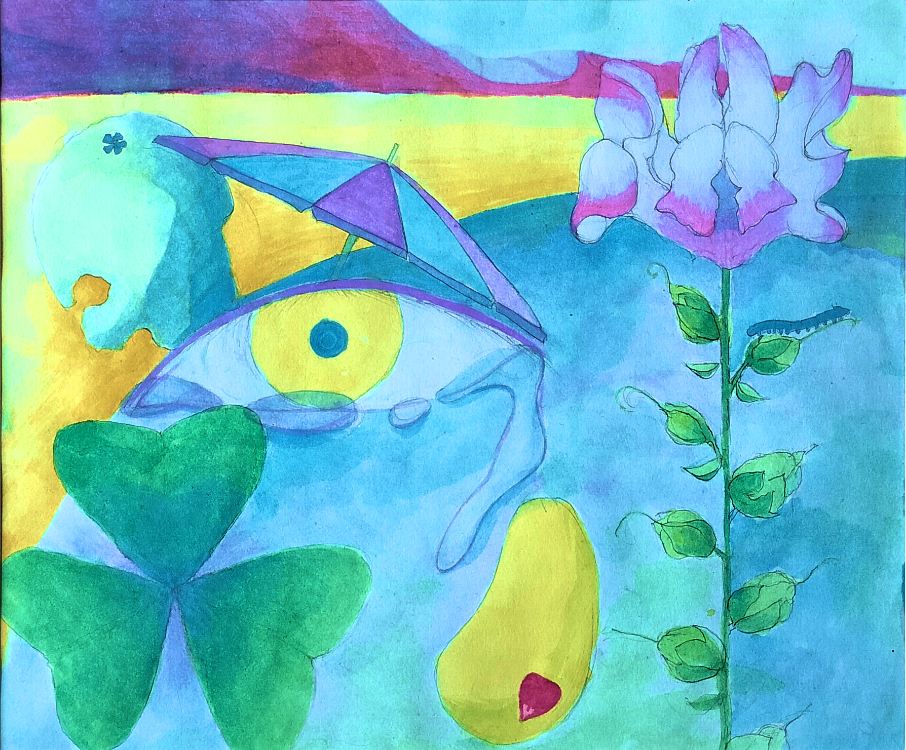 This is a watercolor painting I did in Indonesia and Laos in 2011. There is a place called Lake Toba on the island of Sumatra in Indonesia. It is a very large and beautiful lake, a caldera lake formed by an ancient volcanic eruption. I did quite a lot of paintings while I was there. The paintings on the bottom row, EMERGENCY and the woman’s eye, were painted on an island called Don Det in Laos. Thanks to the guidance of someone I met on the island, I ended up working and living in Cambodia.