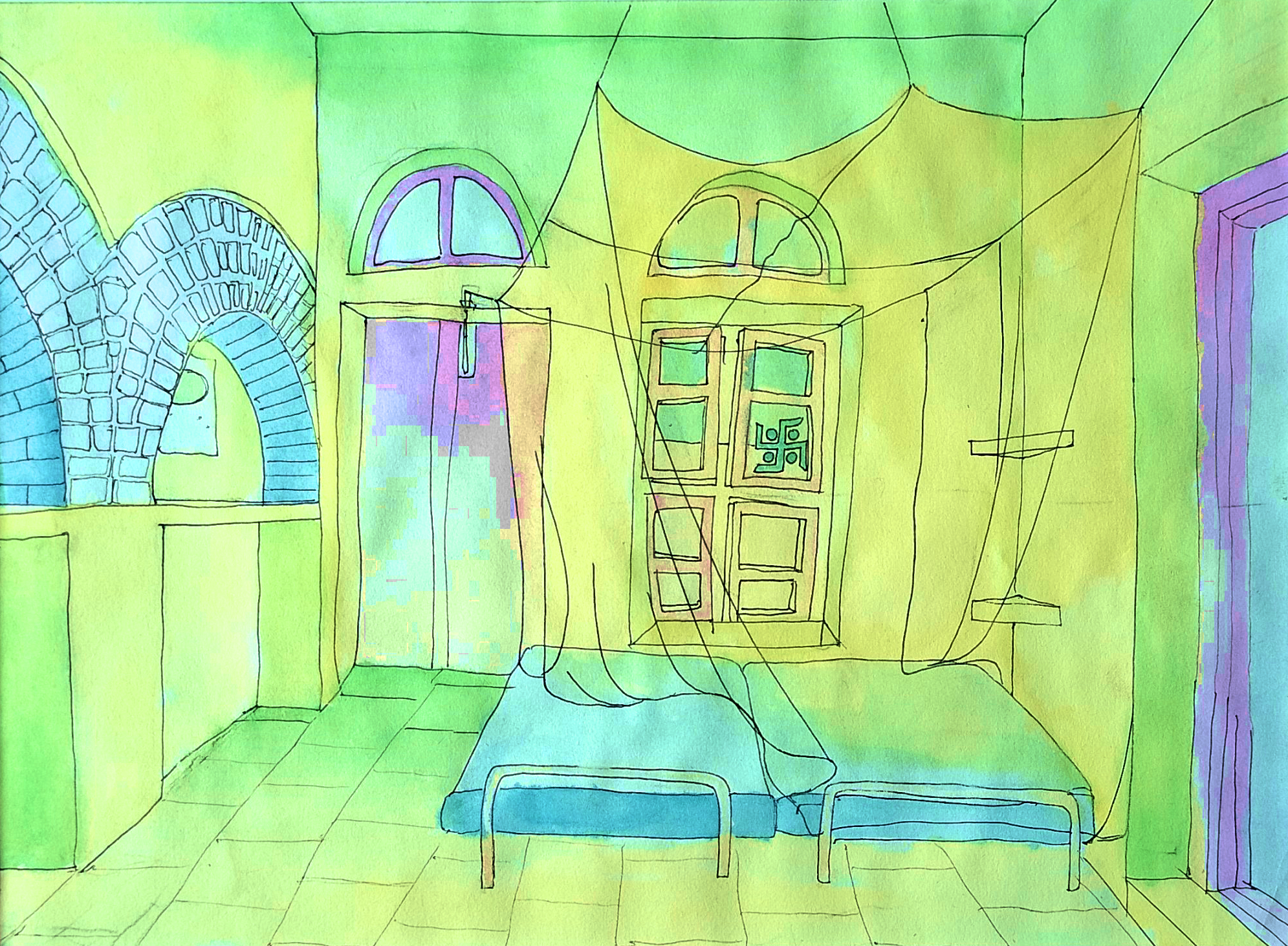 2007年にインド、2008年にタイで描いた水彩画です。この時はチベットから始まる長旅で、大阪から船で上海へ行き、中国を横断する形で鉄道で西端まで行きそこからバスでチベットに入りました。その後ネパールからインド、東南アジア、オーストラリア、またインド、最後にバリでろうけつ染めのバティックを作るという数年間の旅でした。その時に久しぶりに水彩で好きなように描くことをして、そこからまた絵を描くことを蓄積させて行きました。